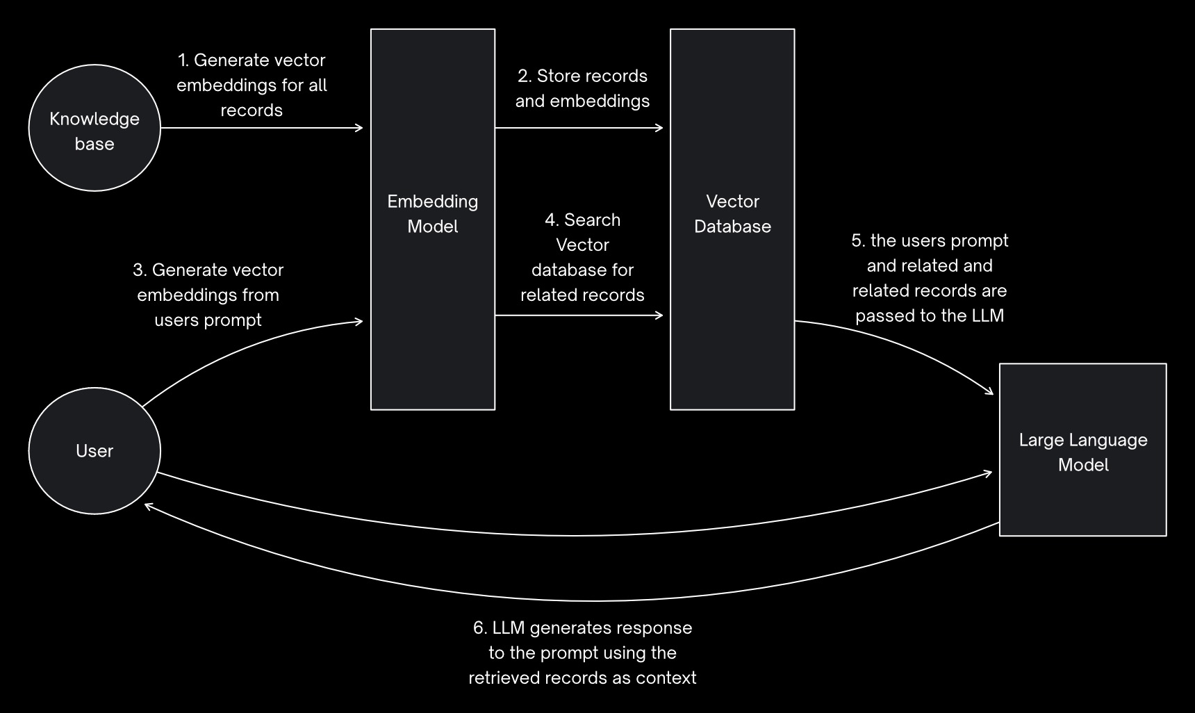- generate a vector embedding from the prompt (i.e.: the query or question) provided by the user
